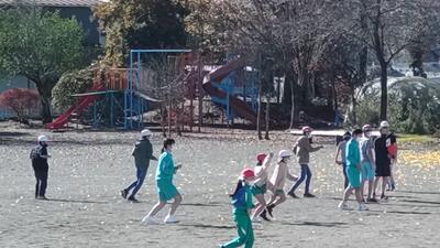 避難訓練は毎月園内で行っているそうですが、今回は水害を想定しての避難訓練のため、第二次避難場所である本校にお越しくださったのです。園児の皆さんは、先生方との約束を守り、一列で静かに避難していました。