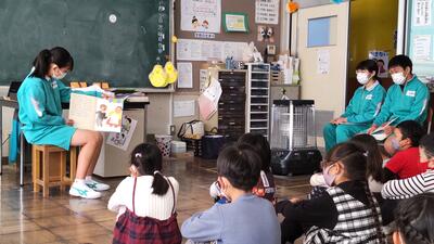 本日は、1年生2年生への読み聞かせをしてくださいました。昨日から図書室で、1年生2年生が興味をもてそうな本を選んでくださっていました。子どもたちは、食い入るように本を見つめていました。