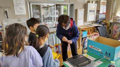 町内の様々な事業所で行われ、本校にも3名の生徒さんが来ています。3名さんとも本校の卒業生です。早速、5年生6年生の外国語科の授業の補助や、休み時間に子どもたちとともに遊ぶなど積極的に活動していました。子どもたちから大人気の3名さんです。あと2日間ではありますが、たくさんのことを学んで学校に戻ってほしいと思います。