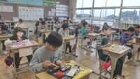 早速、子どもたちは「お願い札」を箱の中に入れました。このお札は、米袋を再利用して作られています。 1年生はお家の方と一緒に願い事を考えるために「お願い札」を持ち帰りました。