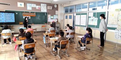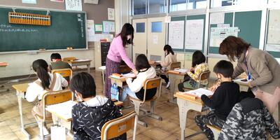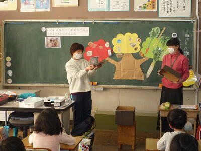 町の学校栄養教諭の小林陽子先生を講師にお招きし、1年生と5年生が「食に関する指導」をしていただきました。