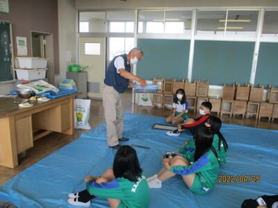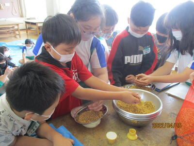 環境ボランティアの赤羽啓一様を講師にお迎えして、「ゆうだい21」の種まきを行いました。5年生は「総合的な学習の時間」に、種もみから「芽出し」を行い、田植え、稲刈り、販売までの学習に取り組んでいます。