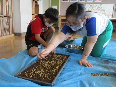 必要な水分を十分に含ませた種もみを、土の入った「育苗箱」にまきました。まんべんなくまくことが「芽出し」のこつです。この後、約20℃の温度と十分に湿度を保って、芽が出るのを待ちます。