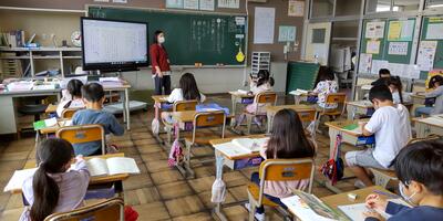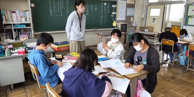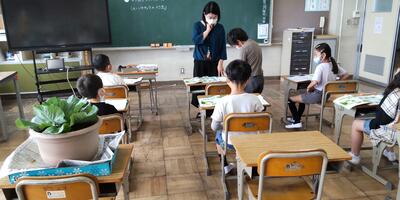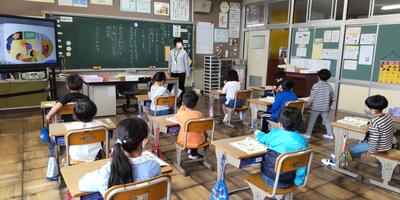 1年生は、「算数」の授業です。「5」の数について学習しています。皆の前で発表していますね。