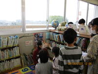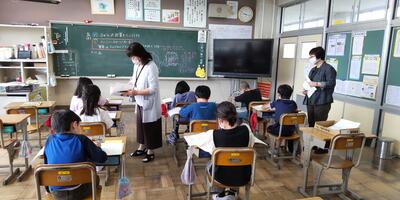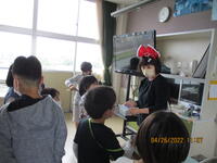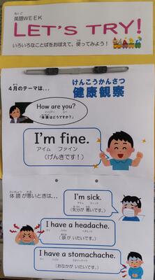 「英語Week」では、朝のあいさつを「good moring」「こんにちは」を「good afternoon」とやり取りします。「朝の会」での健康観察や、「給食」の献立発表も英語で行います。