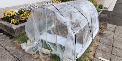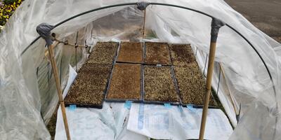 育苗箱で温度と湿度管理をしていた苗が少しずつ芽を出してきました。いよいよ苗床トンネルへ移します。これから、温度管理をしながら田植えができる苗の丈まで大切に育てていきます。