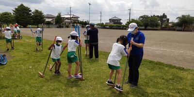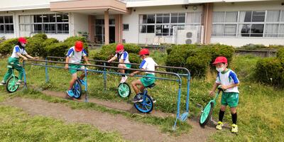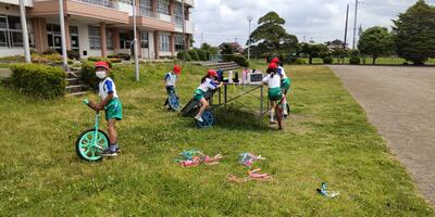 2年生は、「体育」の授業です。一輪車と竹馬に挑戦しています。