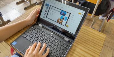 6年生は、「国語」の授業です。ムーブノートを活用して友達の考えと自分の考えを比べています。