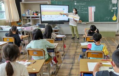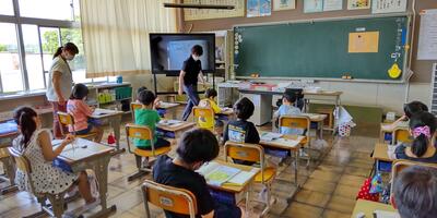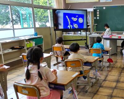 1年生は、「外国語活動」の授業です。数を英語で言っていますね。