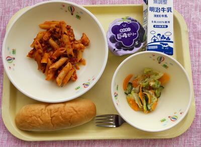 今日の給食は、「みんなが食べられるハートカレー」です。牛乳を停止している児童のみなさんには、「ほうじ茶」を用意してくださいました。「花野菜とハートのパスタのサラダ」に使われているハートのパスタは、「ホワイトソルガム」というイネ科の穀物から作ったパスタです。[「ハートカレー」には、ハート型のにんじんが入っていました。