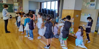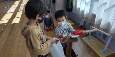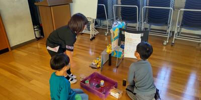 2年生が、「おもちゃランド」に、1年生のみなさんとともにご招待くださいました。空気砲や割りばし射的、ホッケーなど、それぞれ工夫を凝らしたおもちゃの数々。2年生がおもちゃの遊び方を1年生に説明すると、1年生は、おもちゃの作り方を質問していました。