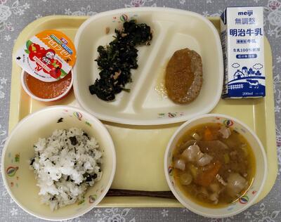 今日は、西小学校6年2組の皆さんのリクエスト給食です。「栄養のバランスを考え、みんなが好きの物を取り入れました。アレルギーのある人でも食べやすいメニューです。」とコメントをいただきました。ハンバーグは皆が大好きなメニューですね。西小学校6年2組の皆さん、ありがとうございました。