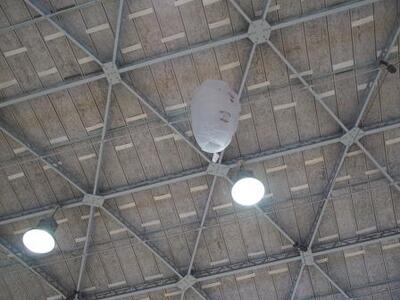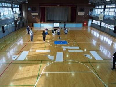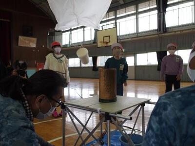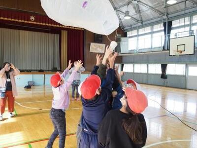 気球について説明をしていただいた後、グループに分かれ、ミニ気球を作りました。出来上がった気球をバーナーであたためると、あっという間に体育館の天井に上がっていきました。