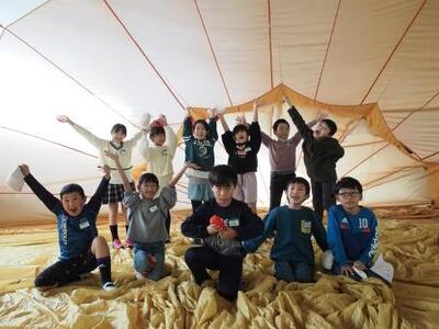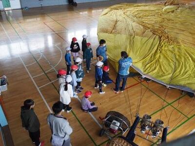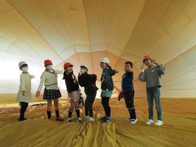 本物の気球の一部を膨らませていただきました。内部に入った子どもたちは、その大きさに驚いていました。