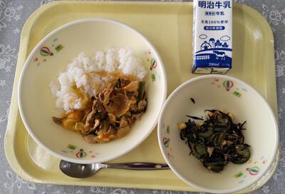 今日は、「ひじきサラダ」です。成長期である小学生の皆さんの身体は鉄とカルシウムをたくさん必要としています。ひじきはそのどちらの栄養素も多く含むため、すすんで食べてほしい食品です。