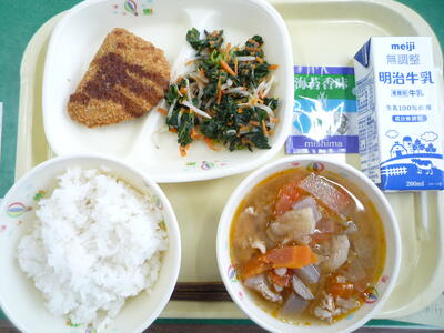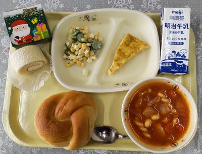 今日は、阿久津中学校1年3組の皆さんが家庭科の授業で考えてくださった献立です。「米粉パンやミネストローネスープなど、みんなが好きなメニューを取り入れ、栄養バランスやいろどりをよくできるように考えました。」というコメントをいただいています。