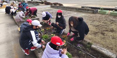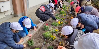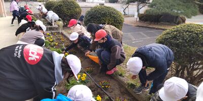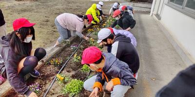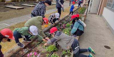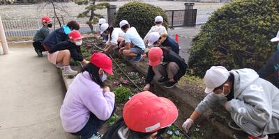 本日の朝の活動は、クリーングリーンタイムです。ふれあい班ごとに、ふれあい花壇の除草を行いました。昨年植え付けていたノースポールからこぼれた種が発芽し、小さな芽を出しています。子どもたちは、小さなノースポールの苗を抜かないように気を付けながら、作業を進めていました。