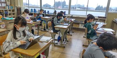 5年生の子どもたちは、「米の主な流通の仕組み」や「農業で働く人の数の変化」など、今までの学習の成果をまとめ米作りの抱える問題や課題について考えを深めています。