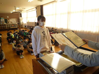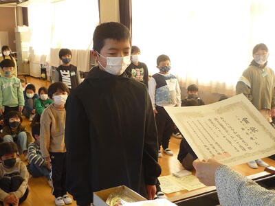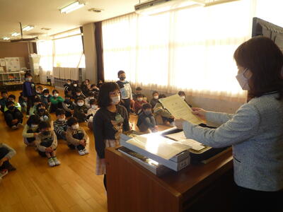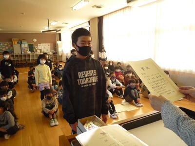 朝の活動の時間を利用して、「冬休み前朝会」を行いました。賞状等の伝達後に、冬休みに向けての話を、校長、児童指導主任が行いました。