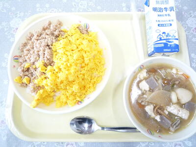 4月最後の給食です。二色丼(大豆入りとりそぼろ、卵そぼろ)、牛乳、キノコけんちん汁です。今日も美味しくいただきました。ごちそうさまでした。来月もよろしくお願いします。