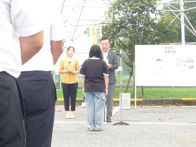 本日より、秋の全国交通安全運動が始まりました。保護者の皆様にもお忙しい中、朝早くから交通当番に御協力いただきましてありがとうございます。高根沢町としては、町民広場駐車場において、8:00より「高根沢町交通安全運動出発式」を挙行しました。式の中で、交通安全ポスター・標語の表彰がありましたが、小学5・6年生標語の部で本校6年生が受賞しました。町長さんから賞状が手渡されました。応募総数180点の中から1点のみ選ばれた作品です。