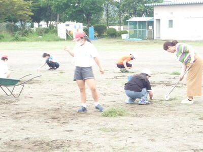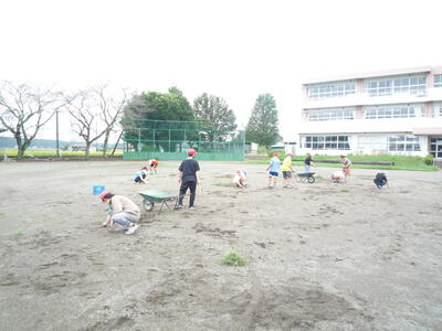 朝の活動の時間、全校生で校庭の除草作業を行いました。「自分たちで学校をきれいにしよう!」とみんな一生懸命作業をしました。全体での活動後、6年生が「もう少しがんばります。仕上げは任せてください!」と頼もしい言葉。おかげできれいになりました。トラックの外側はまだまだ草が生えています。さらに、子ども達の活動環境が整うよう、30日(土)の奉仕作業、よろしくお願いします。