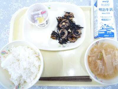 本日のメニューは、「ご飯」、「牛乳」、「納豆」、「ひじきの炒り煮」、「大根と油揚げのみそ汁」です。今日も美味しくいただきました。ごちそうさまでした。