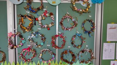 先日、1年生が作成したリースです。素敵なリースができあがりました。