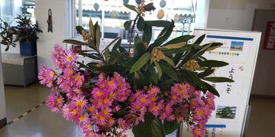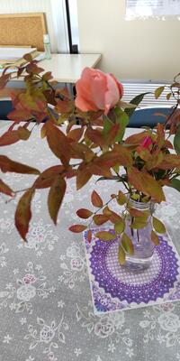 本日も、地域の方からお花をいただきました。野紺菊、ループ咲きの菊、紅葉したユキヤナギ、そして、「ラバグルート(灼熱の溶岩)」「ジャルダン・ド・フランス(フランスの庭)」という名前のバラです。なんと高貴な名前なのでしょう。いつもありがとうございます。