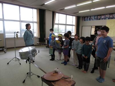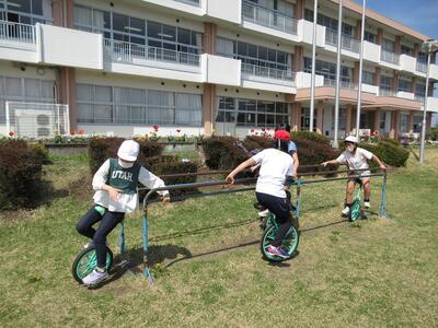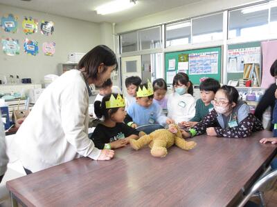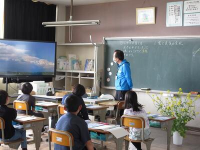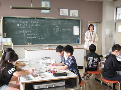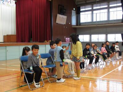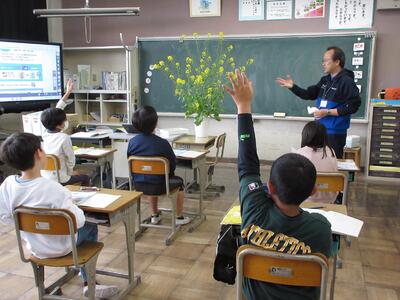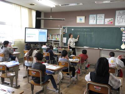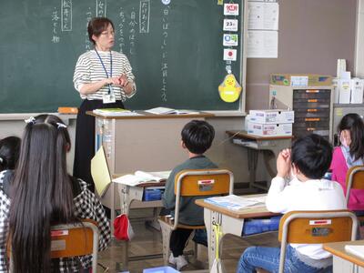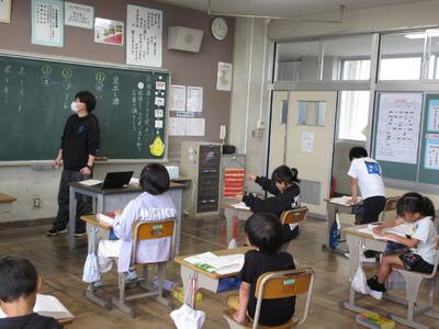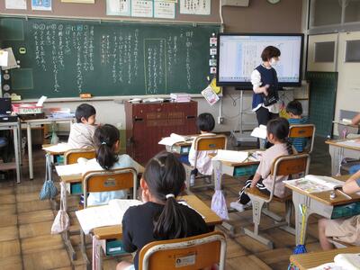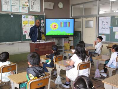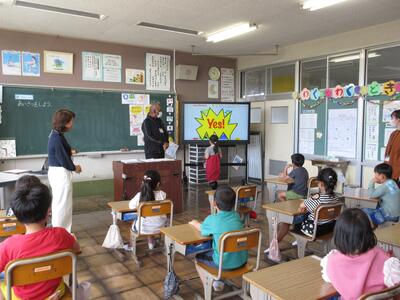写真は、1、2年生の外国語活動のようすです。担任、ALT、JTEの3人で指導にあたっています。