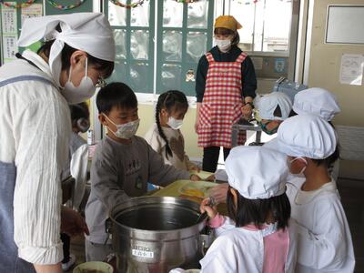 給食当番の子どもたちが上手に配膳し、もらう子たちもトレーを両手でしっかり持って上手に受け取っていました。