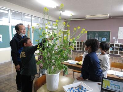 実物を手に取って、「黄色い粉が付くね。」「花は先端の方に咲いてるね。」など気付いたことを話し合いました。