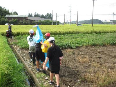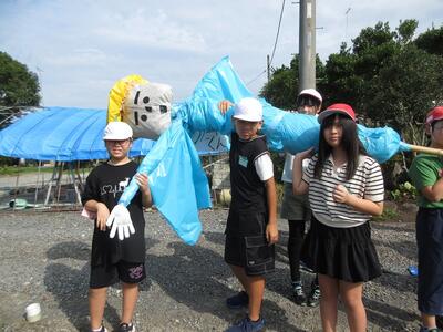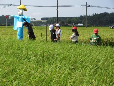 今日はみんなで田んぼに行き、稲の成長の様子の観察と、案山子の設置をしてきました。