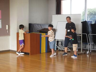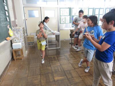 空気でっぽうを使って、閉じ込められた空気の性質を調べています。