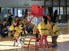 1・2年生は、「にこにこ元気あきまつり~おみこしわっしょいドドンガドン~」の題名で発表しました。まず、全員で歌を歌い、おみこしを担ぎました。その後、グループに分かれ、電車・おかしやさん・釣り堀・ボウリング場・劇などを行いました。また、農園で育てたとうもろこしをポップコ-ンにして配りました。6年生が招待され一緒に楽しみました。