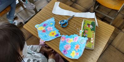 1年生は、「図工」の授業です。色画用紙をやぶいた形から何ができあがるのでしょうか。グループで話し合っています。