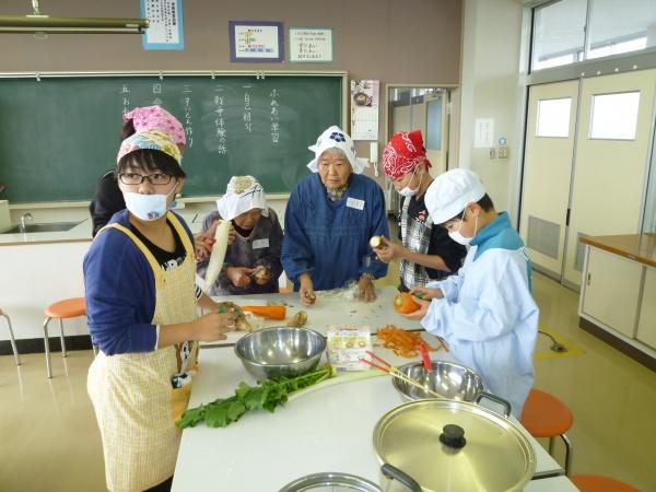 今日は、六年生が「ふれあい学習」を行いました。地域の高齢者5名に来ていただき、戦争体験の話を聞き、一緒にすいとん汁作りをしました。子ども達は、ちょうど今社会科で学習していることもあり、伊奈さんの戦時中の学校や家での生活の様子を興味深く聞いていました。その後のすいとん作りは、手慣れた様子で準備をしました。出来上がったすいとんは、高齢者の方と楽しく談笑しながら食べました。何杯もおかわりする子もいて、みんな大満足の様子でした。