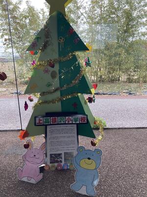昨日、5・6年生で「シトラスリボン」を作りましたが、その「シトラスリボン」を段ボールで作った木に飾り付けをして、本日、宝積寺駅構内のちょっ蔵情報発信館に展示してきました。
