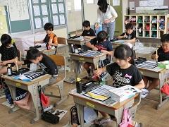 今年度も、鶴見先生と矢田部先生による書写指導が始まりました。対象は、3年生で、月1回実施されます。本格的な指導を受けられるので貴重な機会となっています。20日(金)は、筆の持ち方や動かし方などの基本的な内容の授業でした。