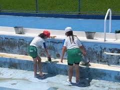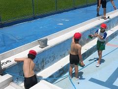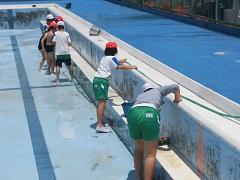 今日はプール清掃を行いました。1年間分の汚れがたまっていてたいへんでしたが、みんなで協力してきれいにしました。まず、1・2校時に3・4年生が行いました。