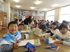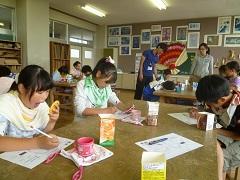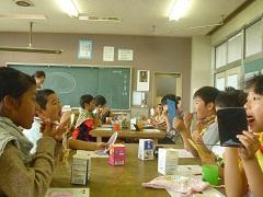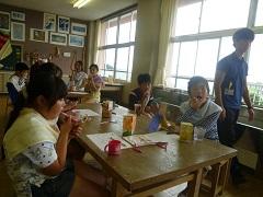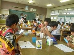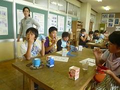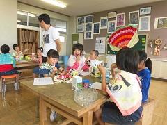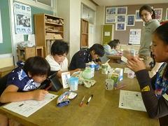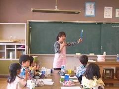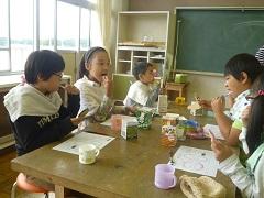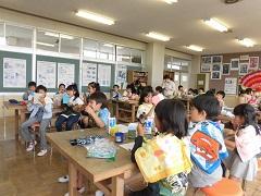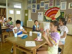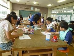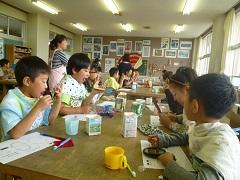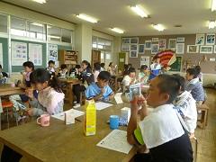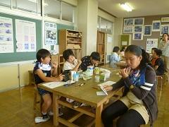 歯科衛生士による歯科保健指導を行いました。歯の役割、仕組み、むし歯のでき方、予防法等についての話を聞いた後、染め出しを実施しました。子どもたちは、鏡で口の中を観察し、赤く染まった部分をワークシートに記入しました。最後に、歯周病を予防するためのみがき方を中心にブラッシング指導を受けました。家庭でも正しい歯みがきの方法を実践させてください。
