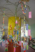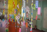 1、2年生の廊下です。児童の願いが竹の短冊に書かれています。