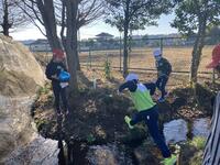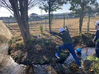 ビオトープは、児童の格好の遊び場です。夏は、ザリガニ釣りに夢中になっていましたが、現在は、川跳びに夢中です。川跳びのルールを決め、安全に配慮して、川幅に応じて各自跳んでいますが、時々は、川に落ちそうになってしまい、シューズ等が濡れてしまうこともあります。