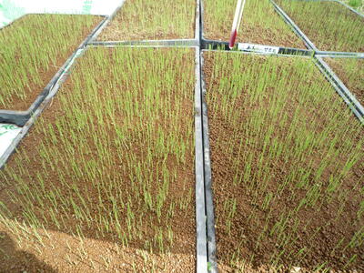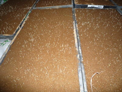 育苗箱で温度と湿度管理をしていた苗が少しずつ目を出してきました。いよいよ苗床トンネルへ移します。