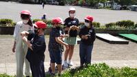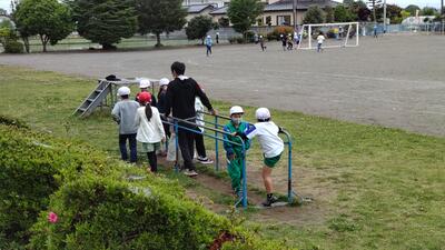 5年生のマイブームは、シロツメクサでの輪飾りつくりです。校舎花壇前にはたくさんのシロツメクサが自生?しています。作り方を友達に教わりながら、きれいな輪飾りつくりを目指しているようです。