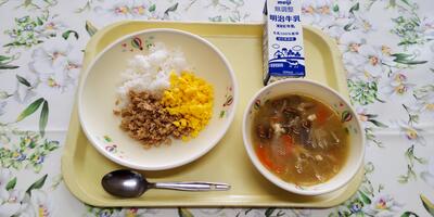 二色丼の鶏そぼろには、大豆ミートが使われています。大豆ミートは、油分を絞った大豆を乾燥させ、肉のような味や食感が楽しめる加工品です。大豆からできているので、高蛋白質で低カロリー、ビタミン、ミネラル、食物繊維を多く含み、注目されている食品です。きのこけんちん汁には、なめこ、まいたけを始め、町内産の野菜がたくさん使われていて、有難いです。