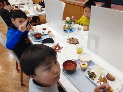 夕食の様子です。今日は、朝早くから一日がんばりました。消費したエネルギーをチャージするために今回ももちろん完食です。5年生のパワーに「あっぱれ❗」