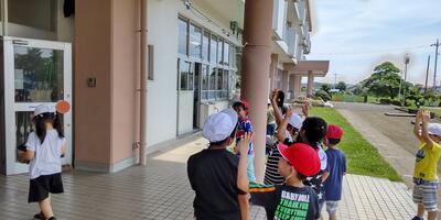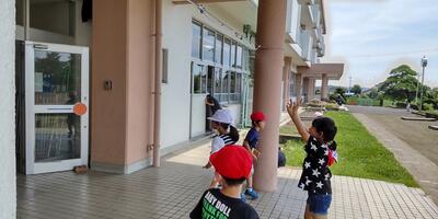 数年前に、ボランティアの方にご協力いただいて設置した東西昇降口のミストが大活躍です。業間の外遊びから戻ってきた子どもたちは、とても元気です。本日も熱中症には十分注意して対応してまいります。