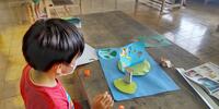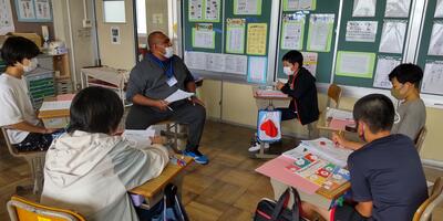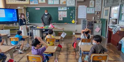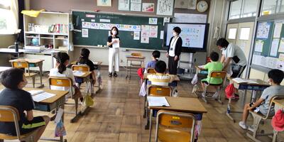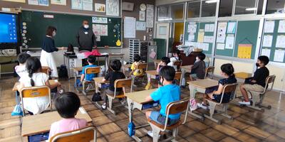 一年生は外国語活動の授業です。隠れている果物の名前をあてています。