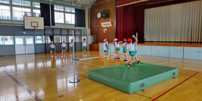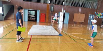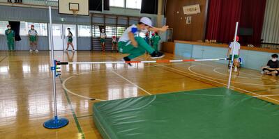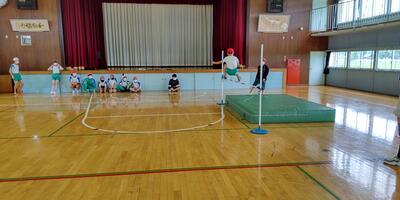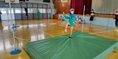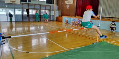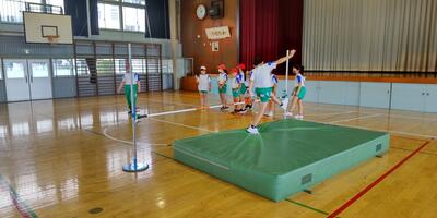 5年生は、「体育」の授業です。走り高跳びに挑戦しています。